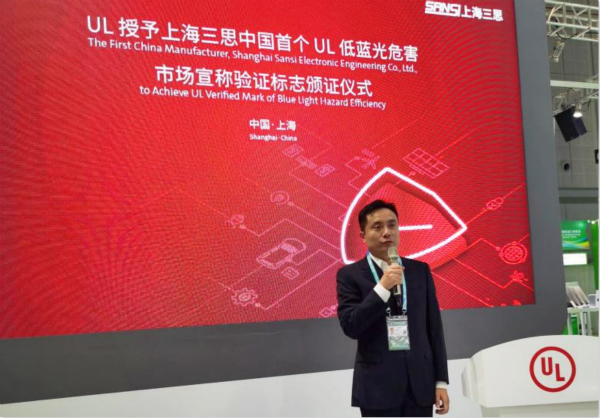 全球著名的安全性標準起草、制訂的第三方機構——UL公司也亮相這一全球盛會,并在此期間(11月6日下午)向上海三思電子工程有限公司(以下簡稱上海三思)頒發了中國首個UL低藍光危害驗證標志證書。