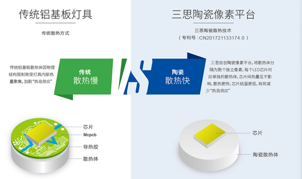 與傳統(tǒng)的鋁基板植物生長燈相比較,三思植物生長燈采用自主研發(fā)的陶瓷像素散熱技術(shù),散熱快,大大降低了芯片結(jié)溫,降低光衰,延長了燈具壽命,同時陶瓷材料在耐溫、防腐、抗壓等方面更勝一籌。