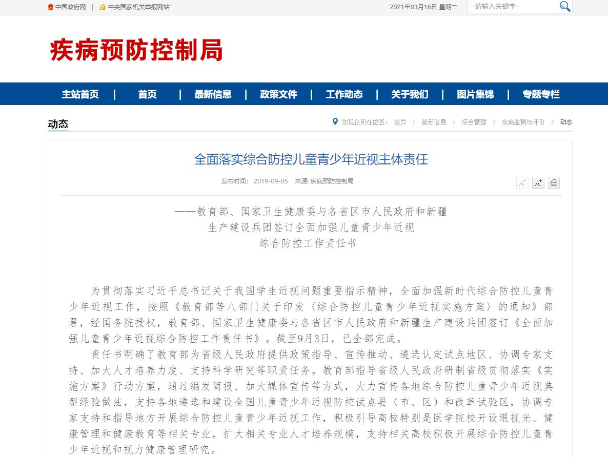 2019年,教育部、國家衛生健康委與多個省級人民政府簽訂《全面加強兒童青少年近視防控工作責任書》,到2023年。力爭實現全國青少年總體近視率在2018年的基礎上每年降低0.5個百分點以上,近視高發省份每年降低1個百分點以上。