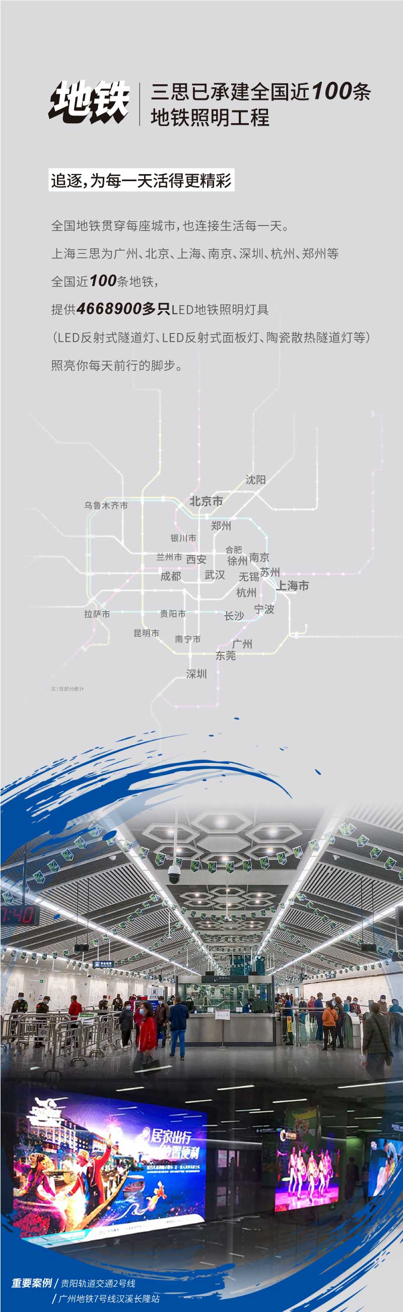 貴陽軌道交通2號線于2021年4月28日全線開通,全線總長41.5公里,共32座車站。其中,上海三思服務共完成了此項目一期12站(公共區(qū)和區(qū)間隧道)、二期4站(設備區(qū))的照明設備供應,共計LED燈具數(shù)量達30000套。
