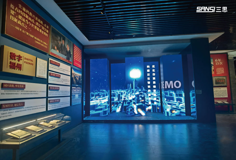 除元宇宙空間外,三思還為展館內(nèi)多個(gè)區(qū)域提供了高精LED顯示及系統(tǒng),進(jìn)行圖文并茂的數(shù)字化展示,講好福州故事。