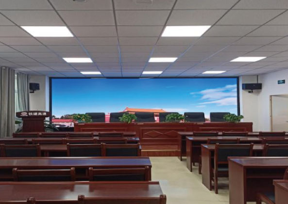 該會議顯示屏為三思P1.875小間距全彩顯示屏,色彩真實,該顯示屏視角寬廣、播出畫面無拼縫,展示細節清晰流暢,畫面逼真無馬賽克。專項定制的會議控制系統刷新率高,能高速實時流暢切換不同會議顯示界面,大大提高了會議效率、圖文及視頻播放流暢清晰。