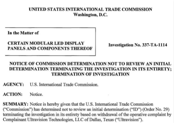 美國時間2月21日,美國國際貿易委員會(ITC)正式下達決定:不復議ITC法官的初步裁決,始于2018年3月27日美國公司針對中國LED顯示屏企業發起的專利侵權案,原告現無條件撤訴!令人關注的LED顯示屏337案件正式結束調查。