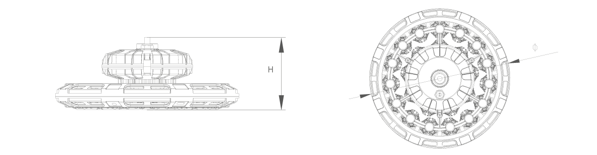 C2300-BE-150W/160W 176 ~ 264 VAC 50/60Hz ≥ 80 30º/60º/90º/120º PC + 陶瓷像素 掛鉤 / 吊桿 / 吊鏈 常亮/DALI/0-10V Φ301*H116mm 約2.58KG